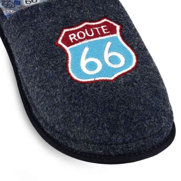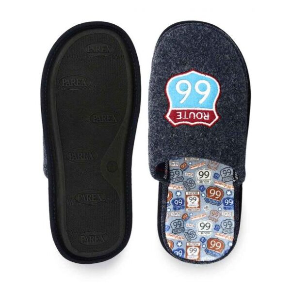 Αγορίστικες χειμωνιάτικες ανατομικές παντόφλες Parex με κεντημένο σχέδιο “Route 66” στο πάνω μέρος και στον πάτο . Διαθέτουν αντιολισθητική σόλα και πλένονται στο πλυντήριο στους 30°C.