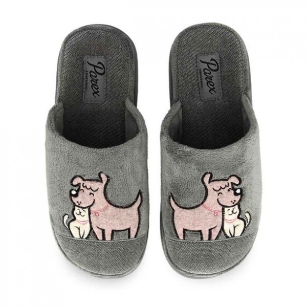 Γυναικείες χειμωνιάτικες παντόφλες Parex. Ο ζεστός και άνετος πάτος σε συνδυασμό με την σόλα που δεν γλιστράει δίνουν ένα τέλειο αποτέλεσμα στην αίσθηση του βαδίσματος μέσα στο σπίτι. Ένα κουταβάκι και μια γατούλα η καλύτερη παρέα για τον φετινό χειμώνα.